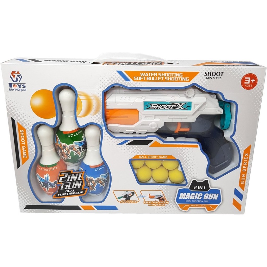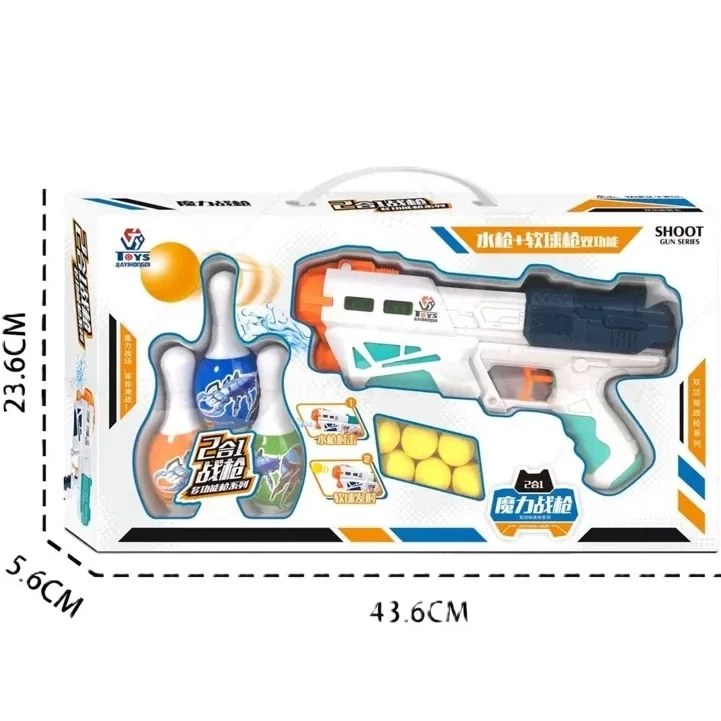 این تفنگ جذاب، دو کارکرد هیجانانگیز دارد: هم میتواند مانند یک آبپاش شلیک کند و هم توپهای اسفنجی بیخطر را پرتاب نماید. در کنار این محصول ۶ عدد توپ سبک و نرم و ۳ عدد پین بولینگ قرار دارد تا کودکان بتوانند علاوه بر بازی تیراندازی، بازی بولینگ و نشانهگیری را هم تجربه کنند.