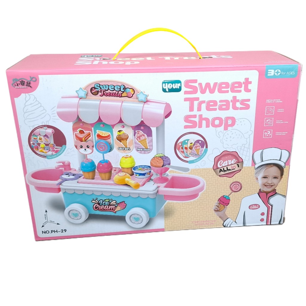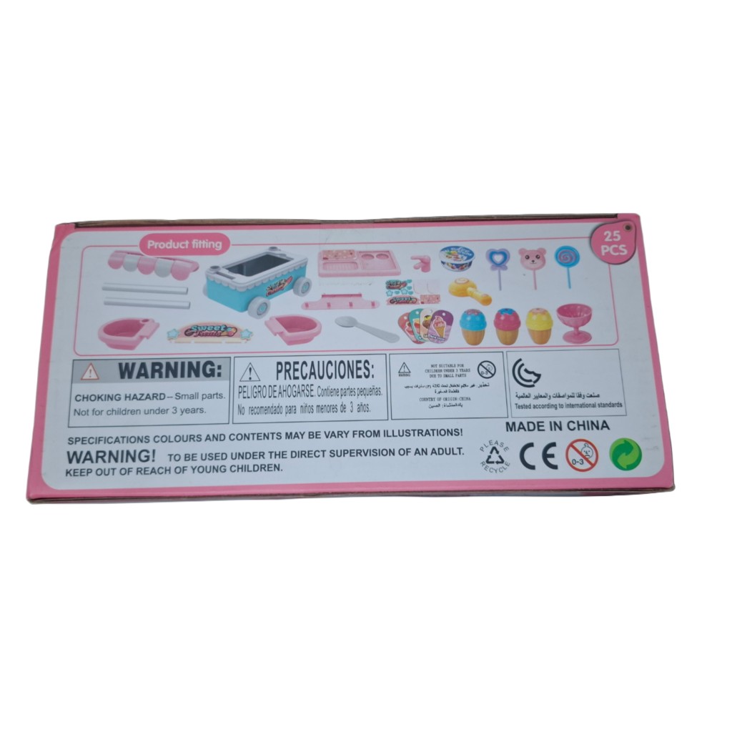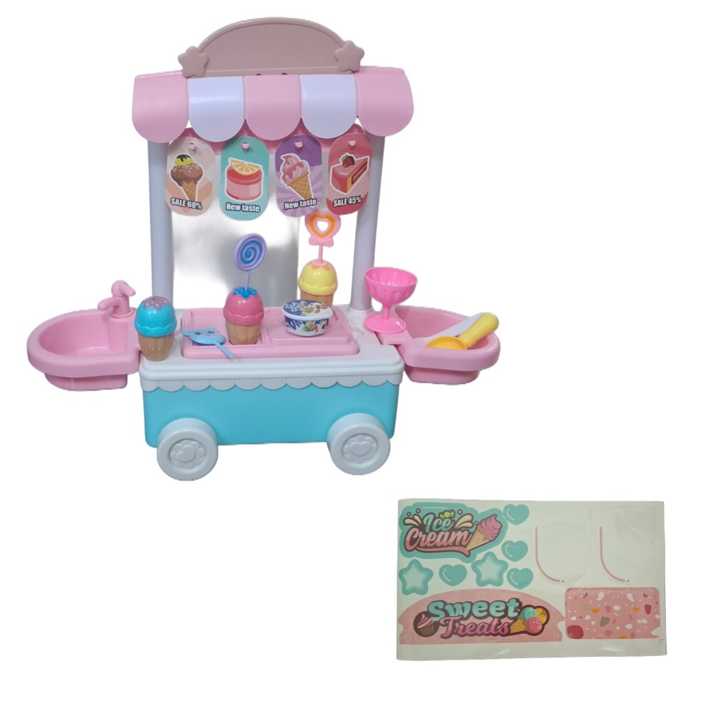 ست اسباب بازی بستنی فروشی شامل یک چرخ سیار بستنی،4 مدل بستنی، قاشق و ظرف بستنی ،اسکوب زن،سینک ظرفشویی میباشد. در این بازی قدرت خلاقیت و تخیل و مهارت های ارتباطی کودک با فروش بستنی به اطرافیان،تقویت می گردد. چیدمان قطعات و جابجایی وسایل مختلف، مهارتهای دستورزی و حرکات ظریف کودکان را بهبود میبخشد. این اسباب بازی مناسب کودکان بالای 3 سال میباشد.