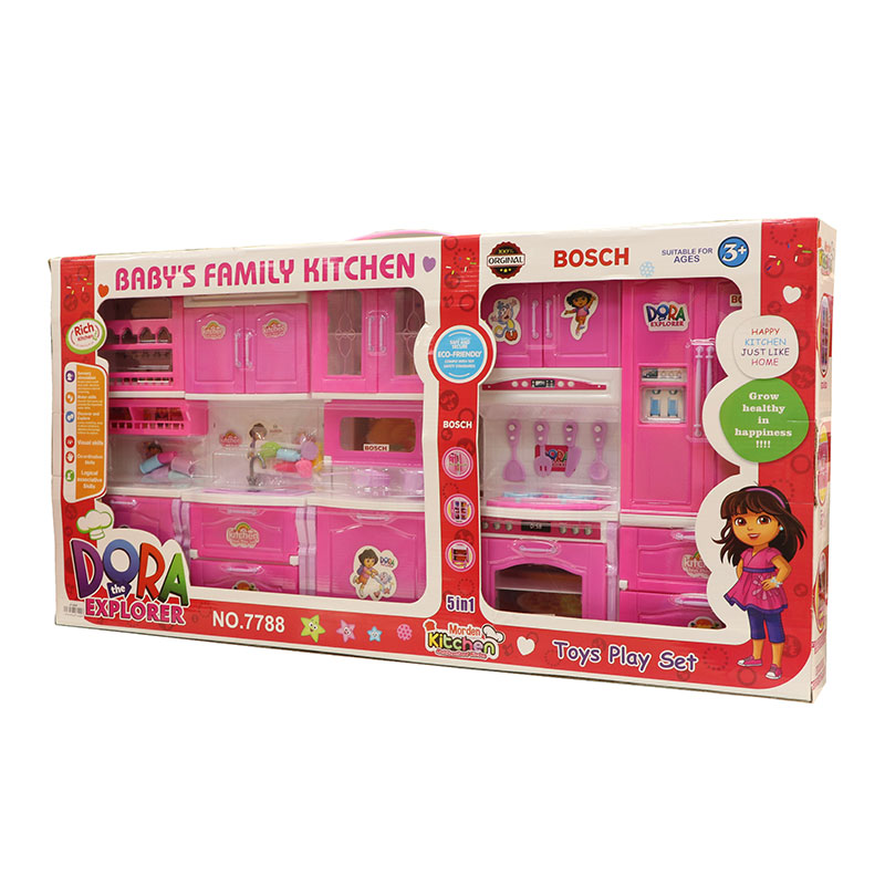 ست آشپزخانه کودک مدل "Baby’s Family Kitchen" با طراحی رنگارنگ و الهامگرفته از شخصیت محبوب Dora the Explorer، یک گزینه عالی برای سرگرمی و تقویت خلاقیت کودکان بالای 3 سال است. این ست شامل اجاق گاز، ماکروفر، یخچال، کابینت،ظرفشویی ،فر و ابزارهای آشپزی است .